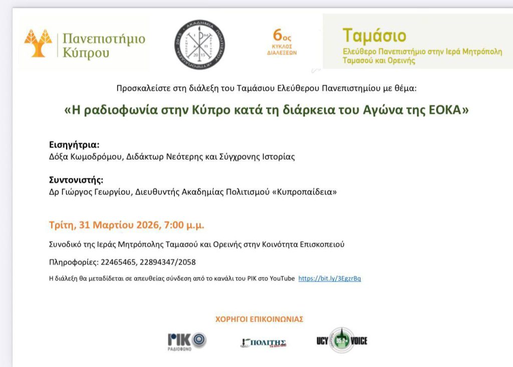 Η Ιερά Μητρόπολις Ταμασού και Ορεινής, σε συνεργασία με το Πανεπιστήμιο Κύπρου, διοργανώνει την 6η διάλεξη του Ταμάσιου Ελεύθερου Πανεπιστημίου, με θέμα ιδιαίτερου ιστορικού ενδιαφέροντος:«Η ραδιοφωνία στην Κύπρο κατά τη διάρκεια του Αγώνα της ΕΟΚΑ». Μέσα από την παρουσίαση της Δρος Δόξας Κωμοδρόμου, οι συμμετέχοντες θα έχουν την ευκαιρία να ταξιδέψουν πίσω στον χρόνο και
