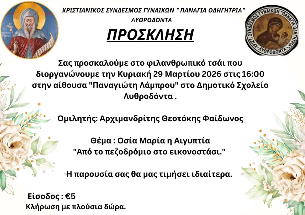 Φιλανθρωπικό τσάι διοργανώνει ο Χριστιανικός Σύνδεσμος Γυναικών «Παναγία Οδηγήτρια» Λυθροδόντα την Κυριακή 29 Μαρτίου 2026 και ώρα 16:00, στην αίθουσα «Παναγιώτη Λάμπρου» του Δημοτικού Σχολείου Λυθροδόντα. Στο πλαίσιο της εκδήλωσης θα πραγματοποιηθεί ομιλία από τον Αρχιμανδρίτη Θεοτόκη Φαίδωνος με θέμα:«Οσία Μαρία η Αιγυπτία – Από το πεζοδρόμιο στο εικονοστάσι». Η εκδήλωση εντάσσεται στις φιλανθρωπικές δράσεις