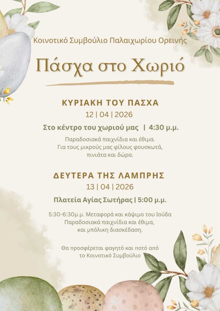Το Παλαιχώρι Ορεινής υποδέχεται το Πάσχα με όμορφες εκδηλώσεις που αναδεικνύουν την παράδοση και φέρνουν την κοινότητα πιο κοντά. Με φόντο τη ζεστασιά του χωριού και τη χαρά των ημερών, μικροί και μεγάλοι καλούνται να συμμετάσχουν σε ένα διήμερο γεμάτο δραστηριότητες και διασκέδαση.